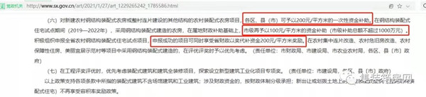 (六)對新建農(nóng)村鋼結(jié)構(gòu)裝配式農(nóng)房或整村連片建設(shè)的其他結(jié)構(gòu)的農(nóng)村裝配式農(nóng)房項(xiàng)目,各區(qū)、縣(市)可予以200元/平方米的一次性資金補(bǔ)助。在鋼結(jié)構(gòu)裝配式住宅試點(diǎn)期間(2019—2022年),采用鋼結(jié)構(gòu)裝配式建造的農(nóng)房,在屬地財(cái)政補(bǔ)助基礎(chǔ)上,市級再予以100元/平方米的資金補(bǔ)助(市級補(bǔ)助總額不超過1000萬元)。積極組織申報(bào)全省農(nóng)村鋼結(jié)構(gòu)裝配式住宅試點(diǎn)項(xiàng)目,申報(bào)成功的項(xiàng)目可同時(shí)享受省財(cái)政以獎代補(bǔ)資金200元/平方米獎勵。在農(nóng)村集中連片改造、農(nóng)村危舊房改造、農(nóng)村保障性住房、美麗宜居示范村等項(xiàng)目中采用鋼結(jié)構(gòu)裝配式建造的,在評優(yōu)評獎時(shí)予以優(yōu)先考慮。(責(zé)任單位:市財(cái)政局、市建設(shè)局、市農(nóng)業(yè)農(nóng)村局,各區(qū)、縣〔市〕政府)