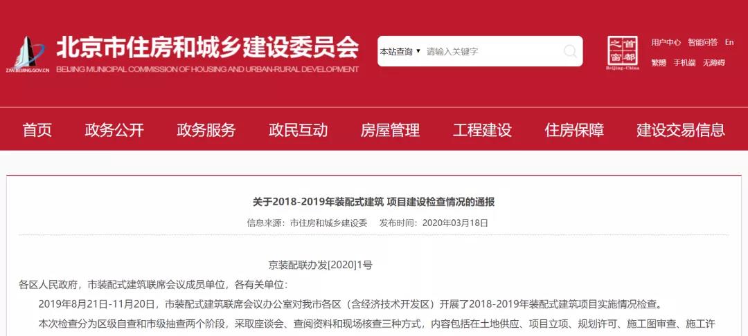 2020年3月18日,北京市發(fā)展裝配式建筑工作聯(lián)席會議辦公室《關(guān)于2018-2019年裝配式建筑項目建設(shè)檢查情況的通報》,內(nèi)容強(qiáng)調(diào):